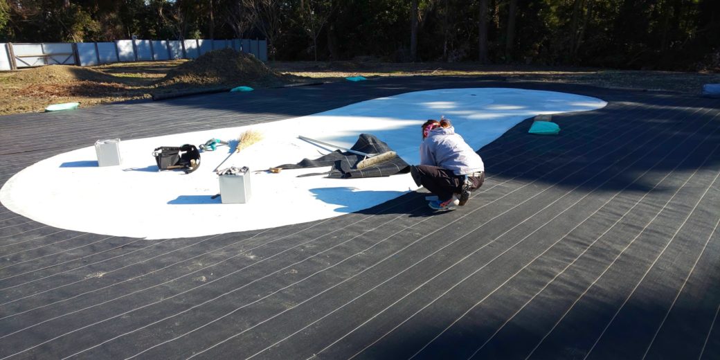 防草シートを形に沿って張り込んでいきますが、より自然なコースに近いように高低や凸凹をわざと作ってあるので形を崩さないようにしていきます。
