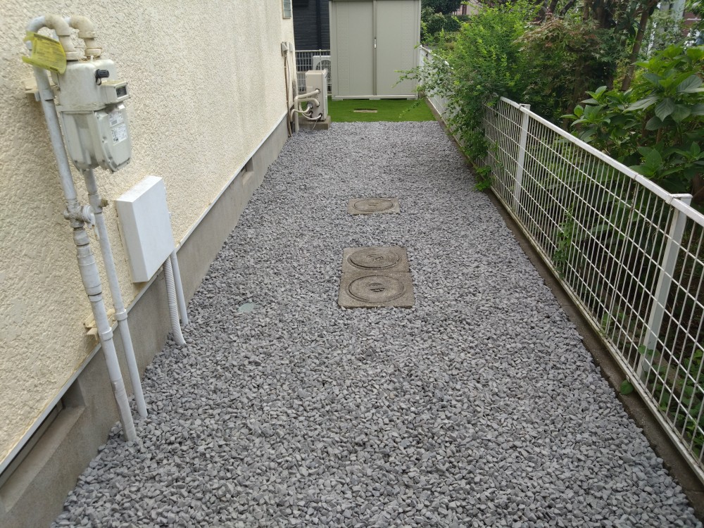 駐車場の裏側は防草シートまでは同じくで砂利を敷きました。