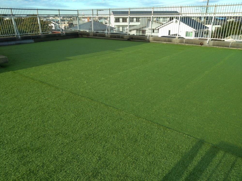 前回の作業では半面まででしたが、今回の作業で全面人工芝の屋上園庭になります。