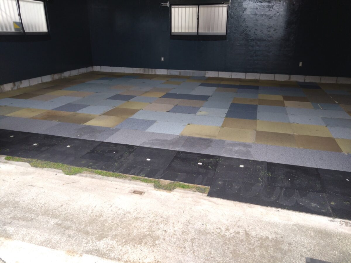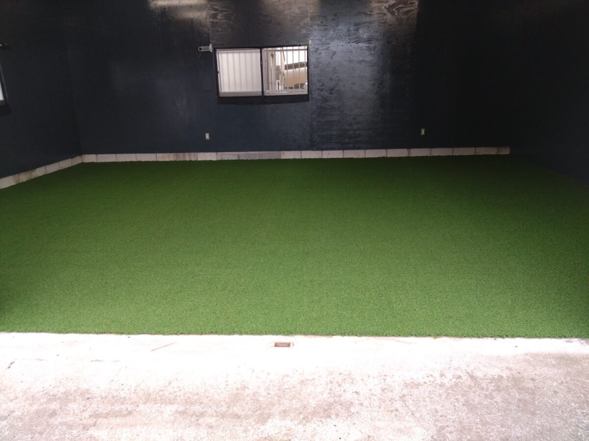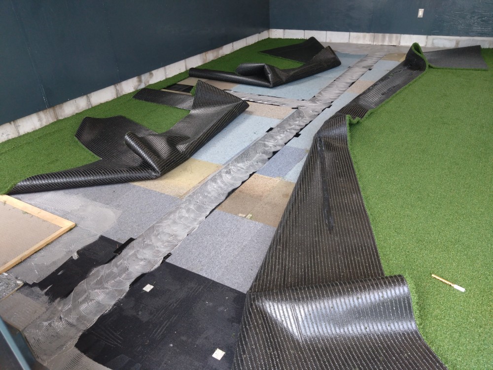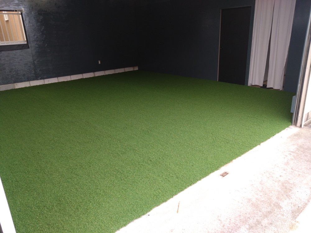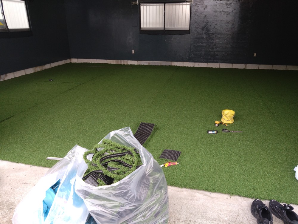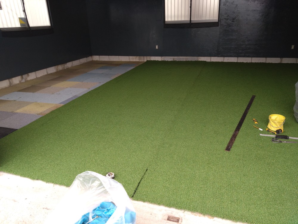下地にはコンクリートの上にタイルカーペットを二重で貼っていただいてましたが、一枚剥がしての施工になります。※使用します人工芝はSターフO2 60mmスポーツタイプになります。