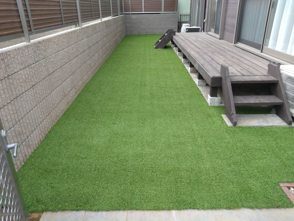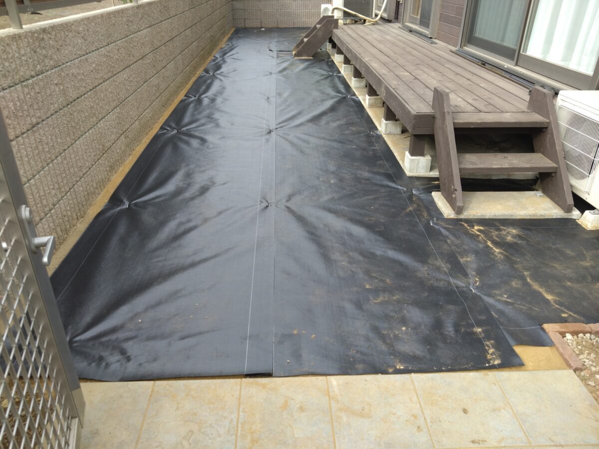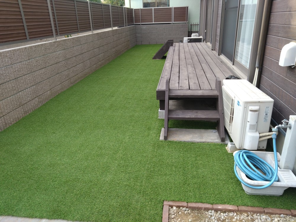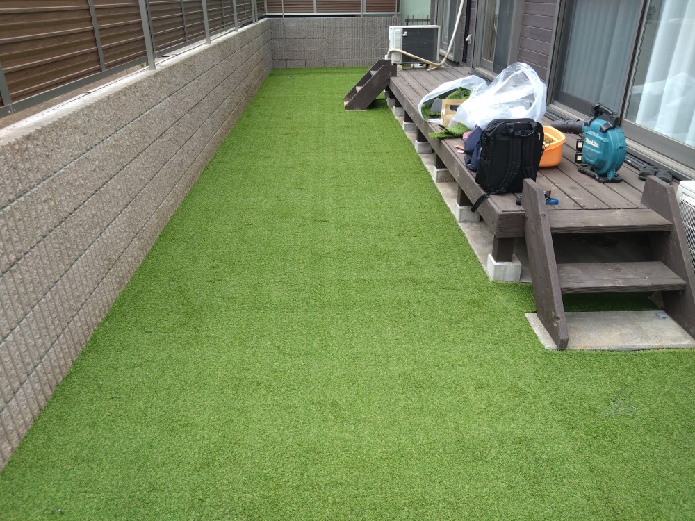 市川市のS様邸。合同会社エム・イー・エル様よりのご依頼で外構工事に合わせての人工芝施工のご依頼です。下地~防草シート張りまではエム・イー・エル様にての作業となりました。