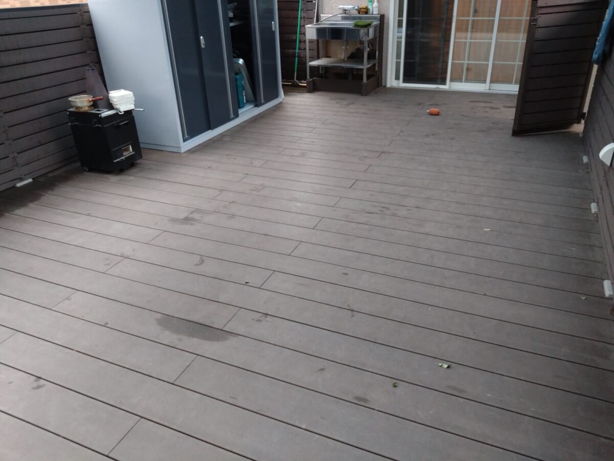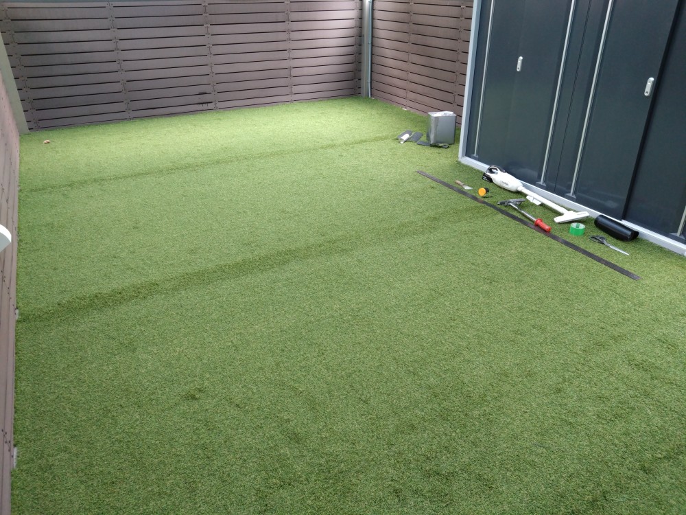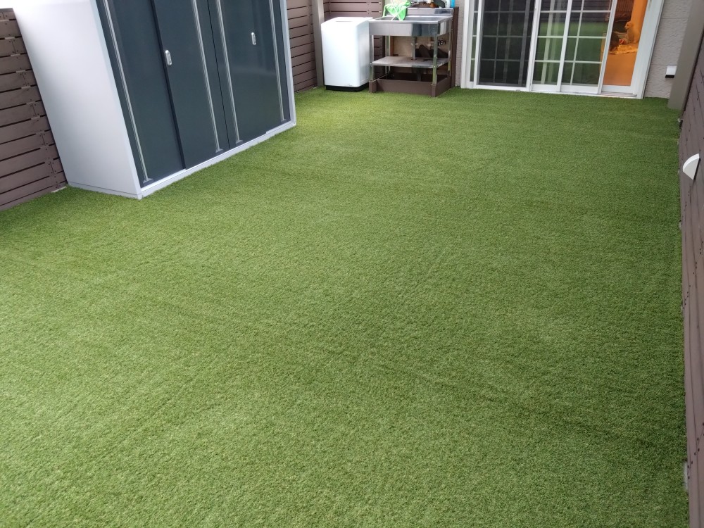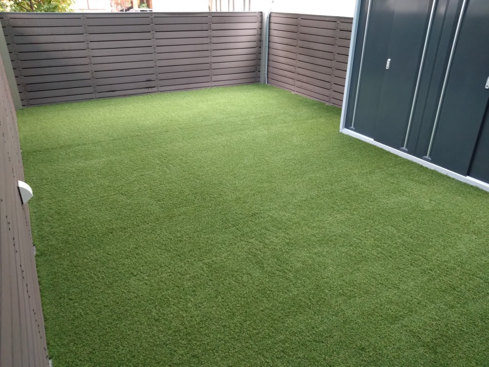 流山市のY様邸。お庭部分がウッドデッキで囲われたプライベート空間になっておりますが、更に人工芝を敷いてワンちゃんたちも子供たちも一緒に遊べるような空間にとの事でご依頼を頂きました。