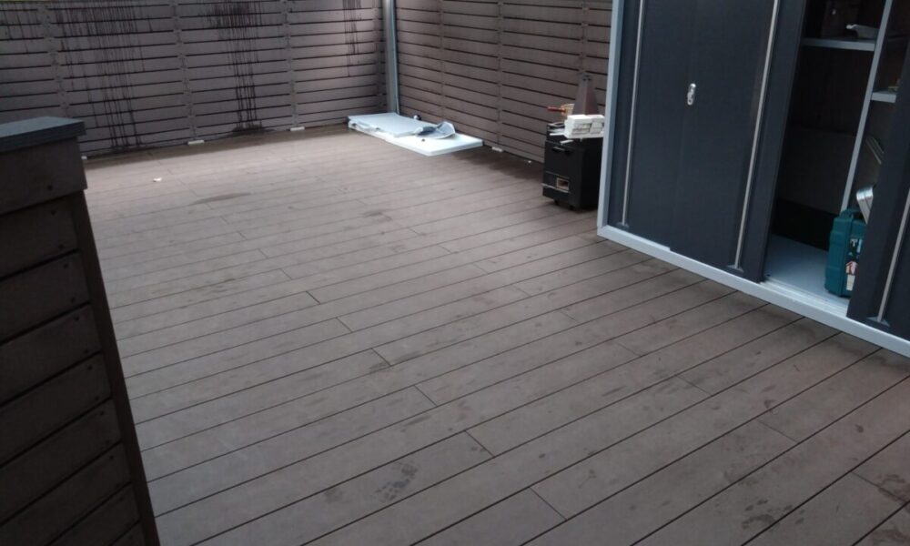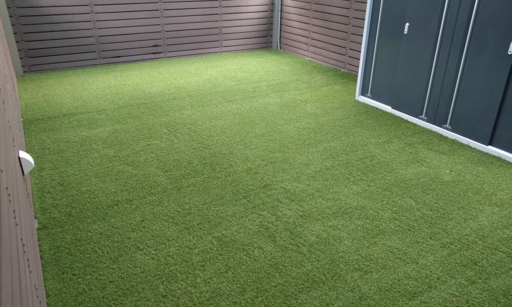 流山市のY様邸。お庭部分がウッドデッキで囲われたプライベート空間になっておりますが、更に人工芝を敷いてワンちゃんたちも子供たちも一緒に遊べるような空間にとの事でご依頼を頂きました。