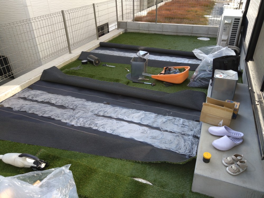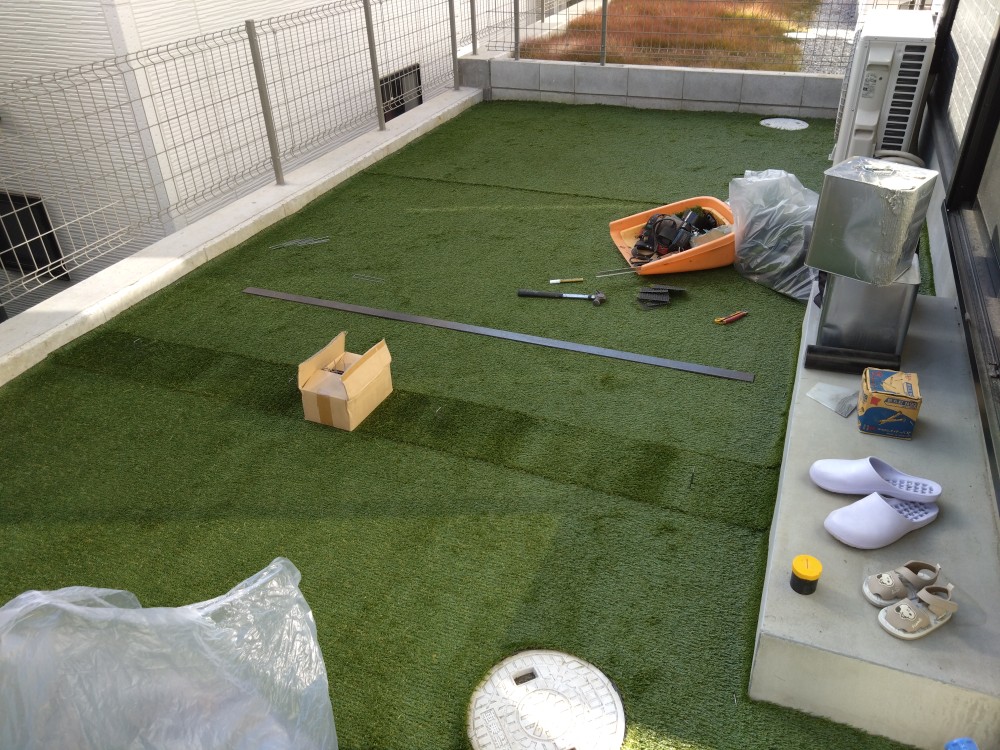 外周周りの釘打ち、清掃をして人工芝の完成です。