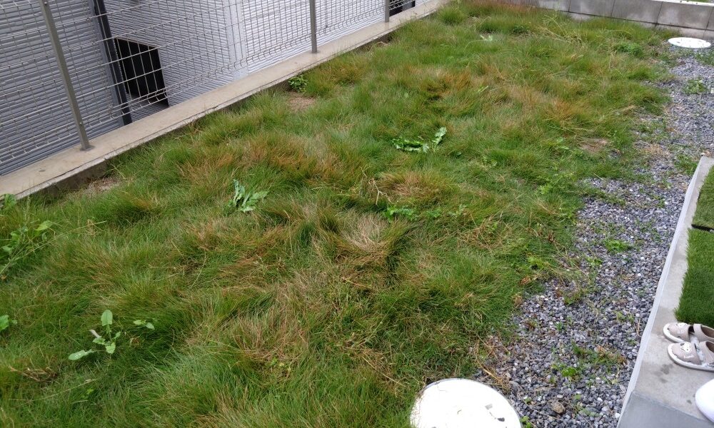 松戸市のM様邸。お庭は完成当時からの天然芝に砂利のお庭でしたが、草むしりを一時忘れていたらあれよあれよと伸びていき今では踏み入ることのないお庭にとの事でした。今後の事も踏まえて人工芝で家族も楽しめるようにとの事でご依頼を頂きました。
