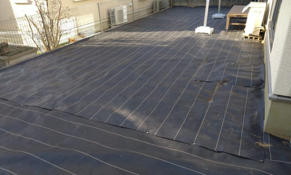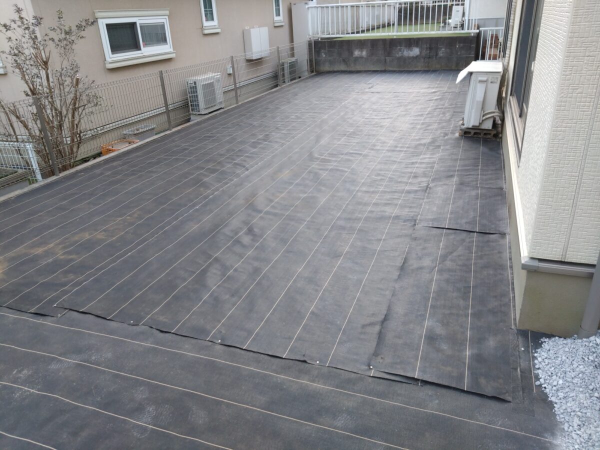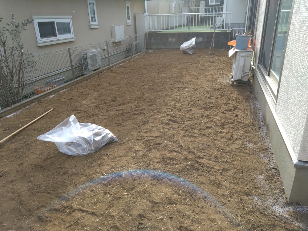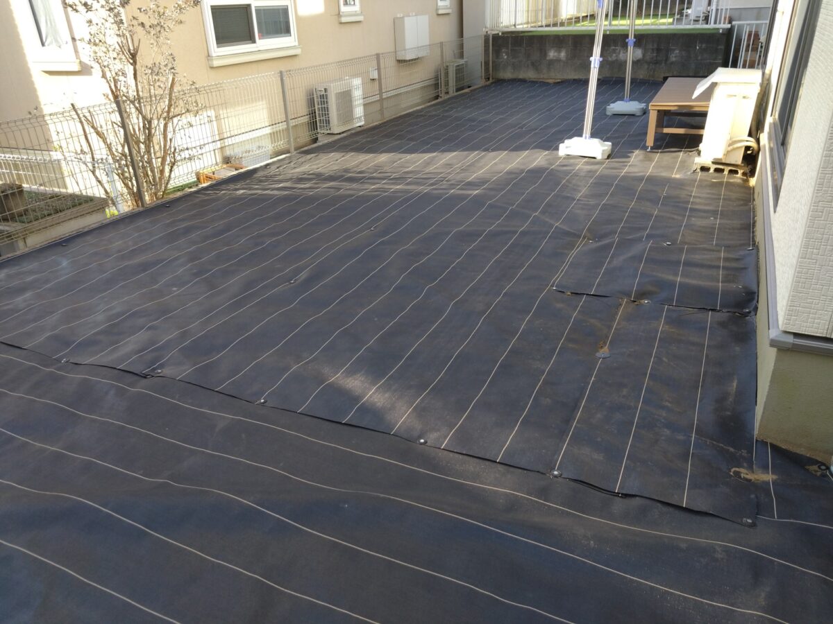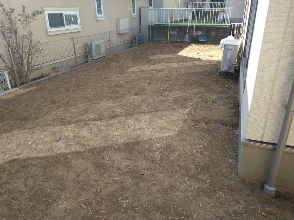 印西市のY様邸。他社にてお庭の草刈りと防草シート張りをお願いしたところ、強風が吹くとシートがめくれ、お庭も使いようが無いとの事で人工芝施工のご依頼を頂きました。