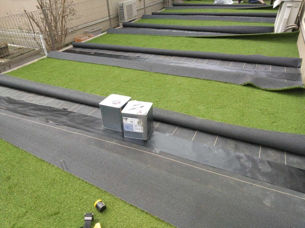 人工芝をカットして仮置きしていきます。その後、ジョイント部分のボンド接着をしていきます。