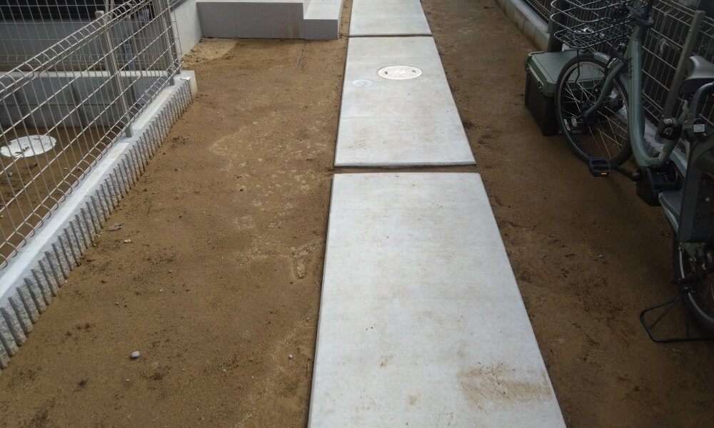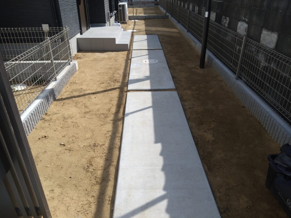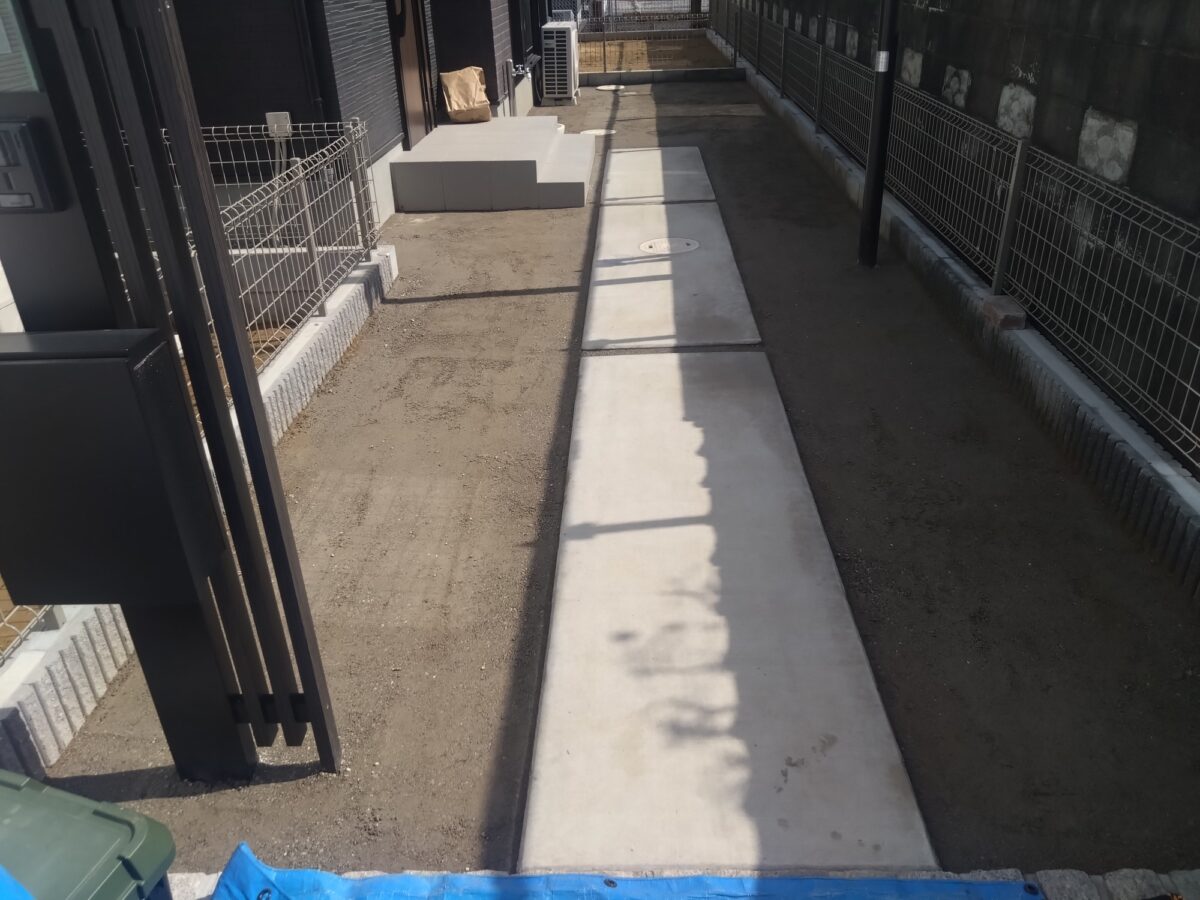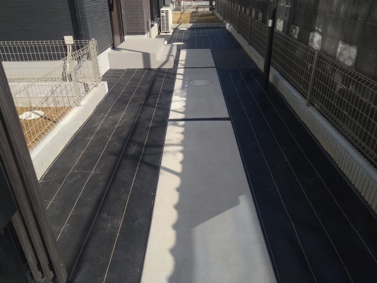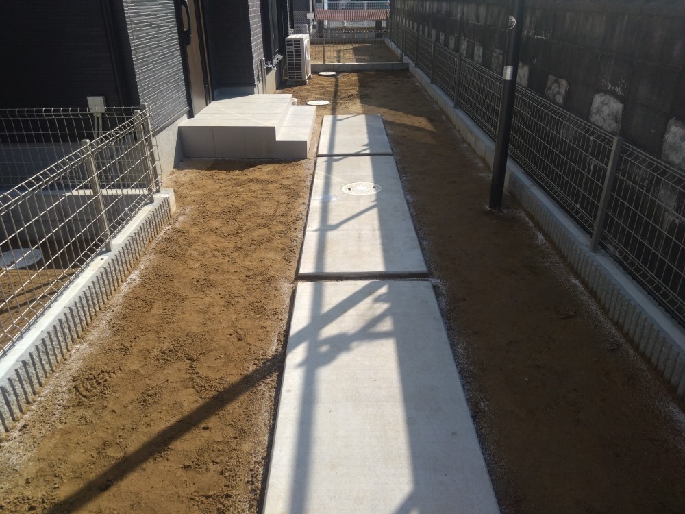 流山市のU様邸。新築のお庭ですが、土の状態で壁や通路の汚れも目立ち、雑草が生い茂ってしまう前に人工芝で綺麗にしておきたいとの事でご依頼を頂きました。