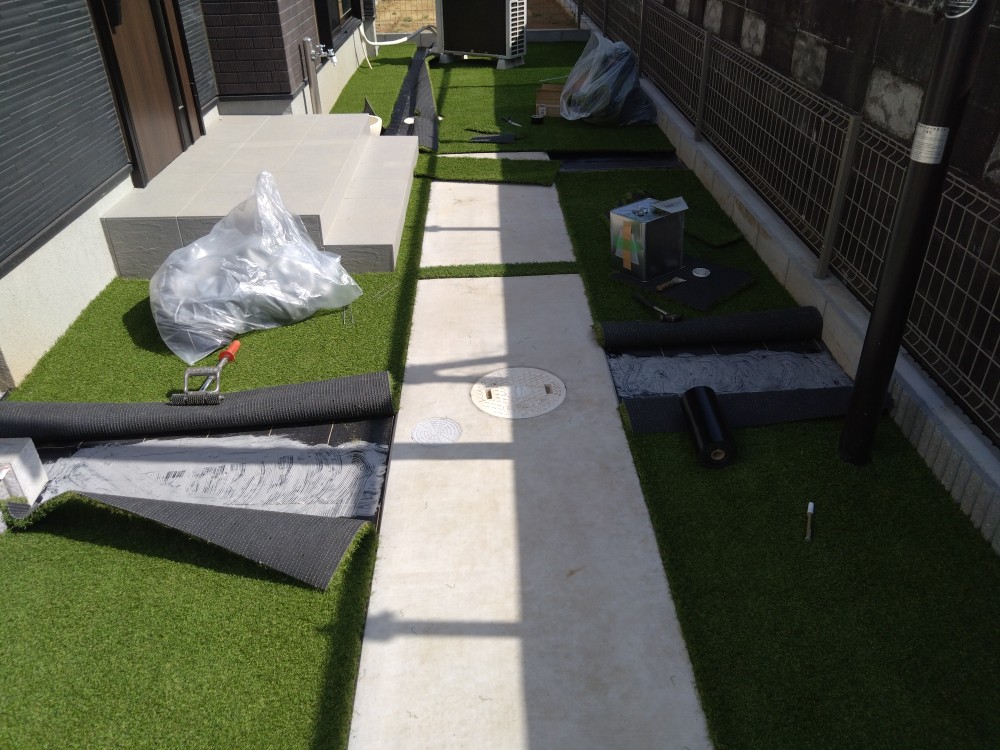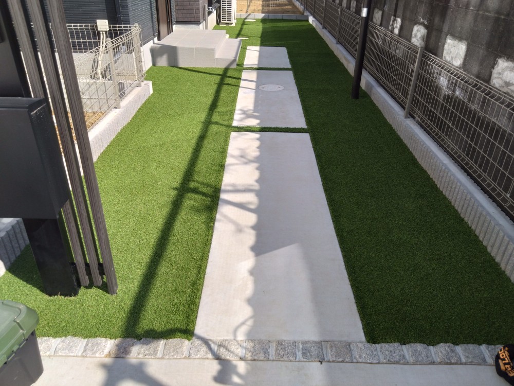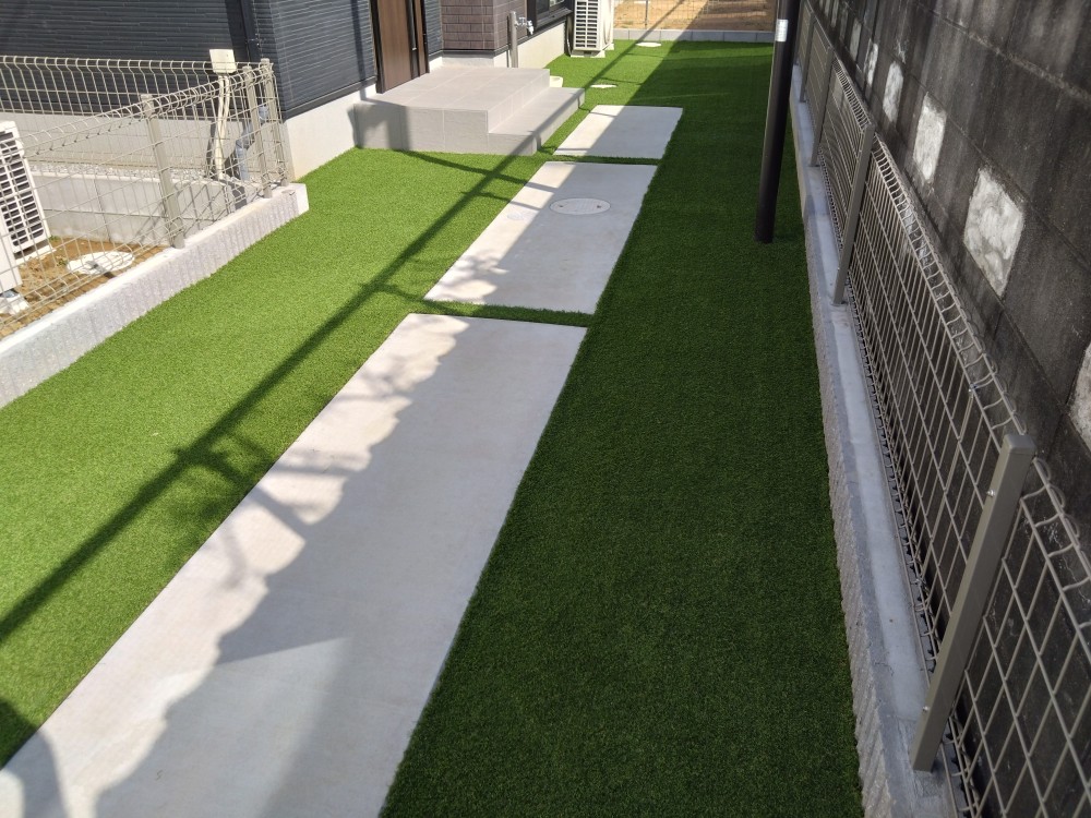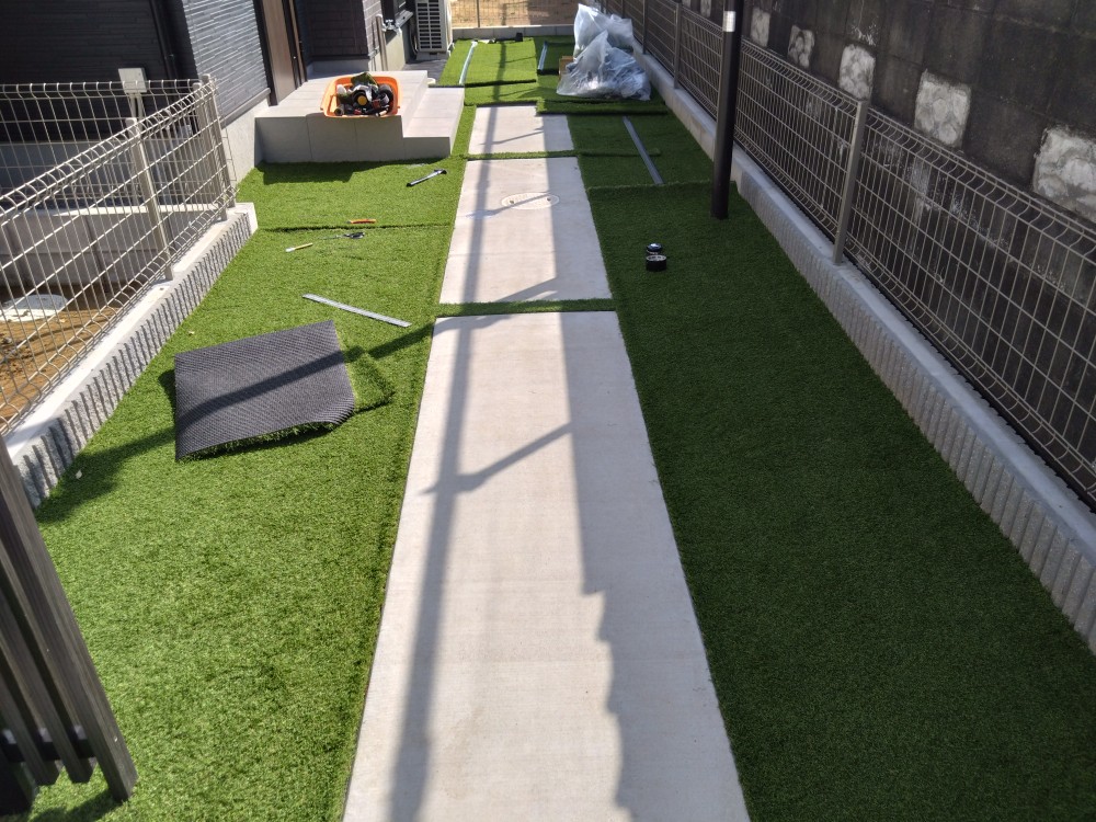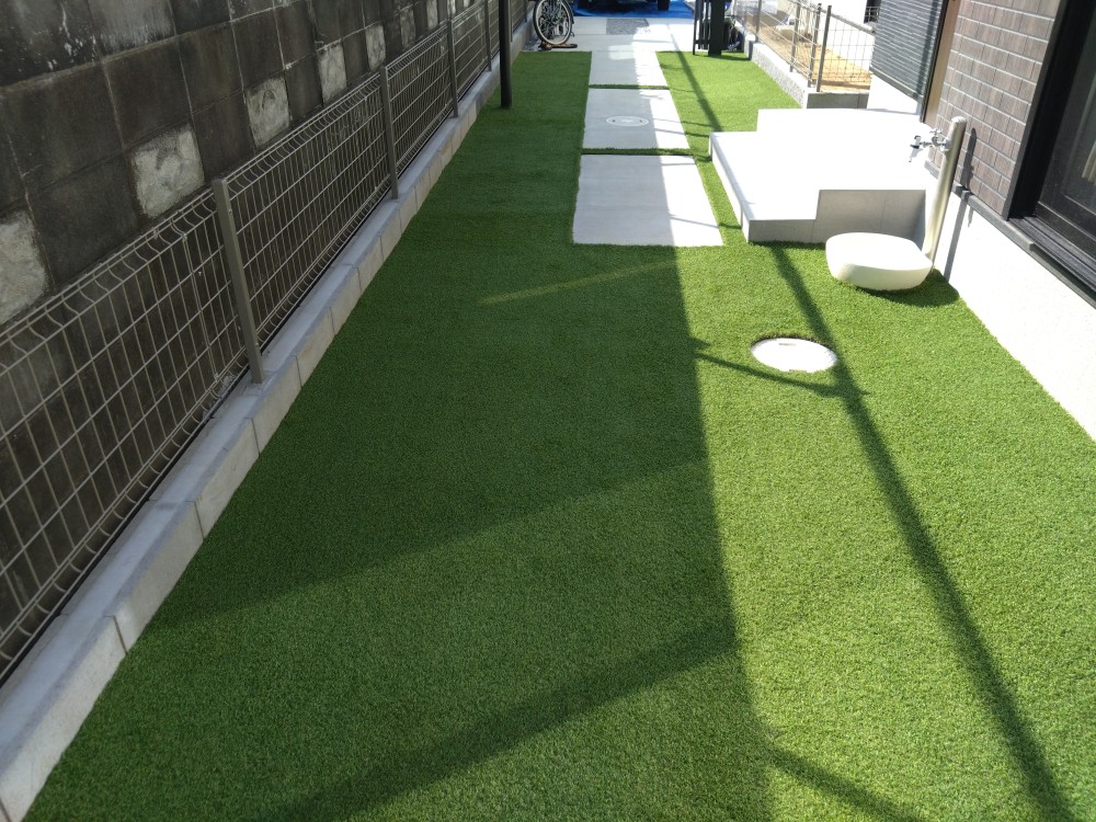 人工芝を敷くことにより土間コンクリートとの調和も取れて外観が良くなるとともに敷地も広く感じられるようになりましたね!