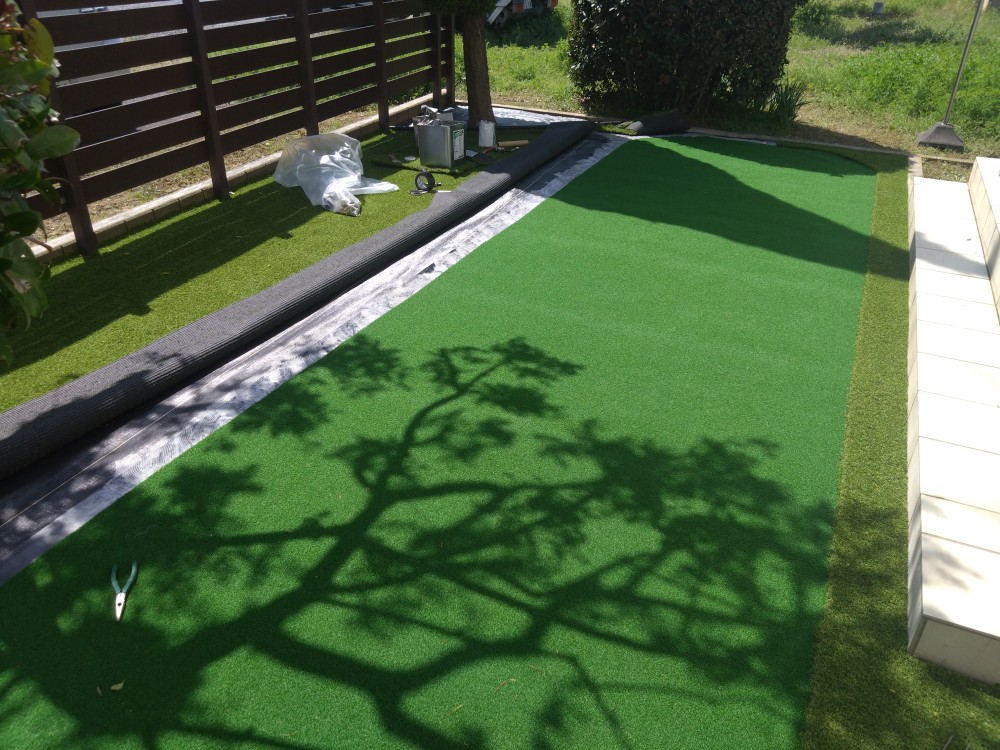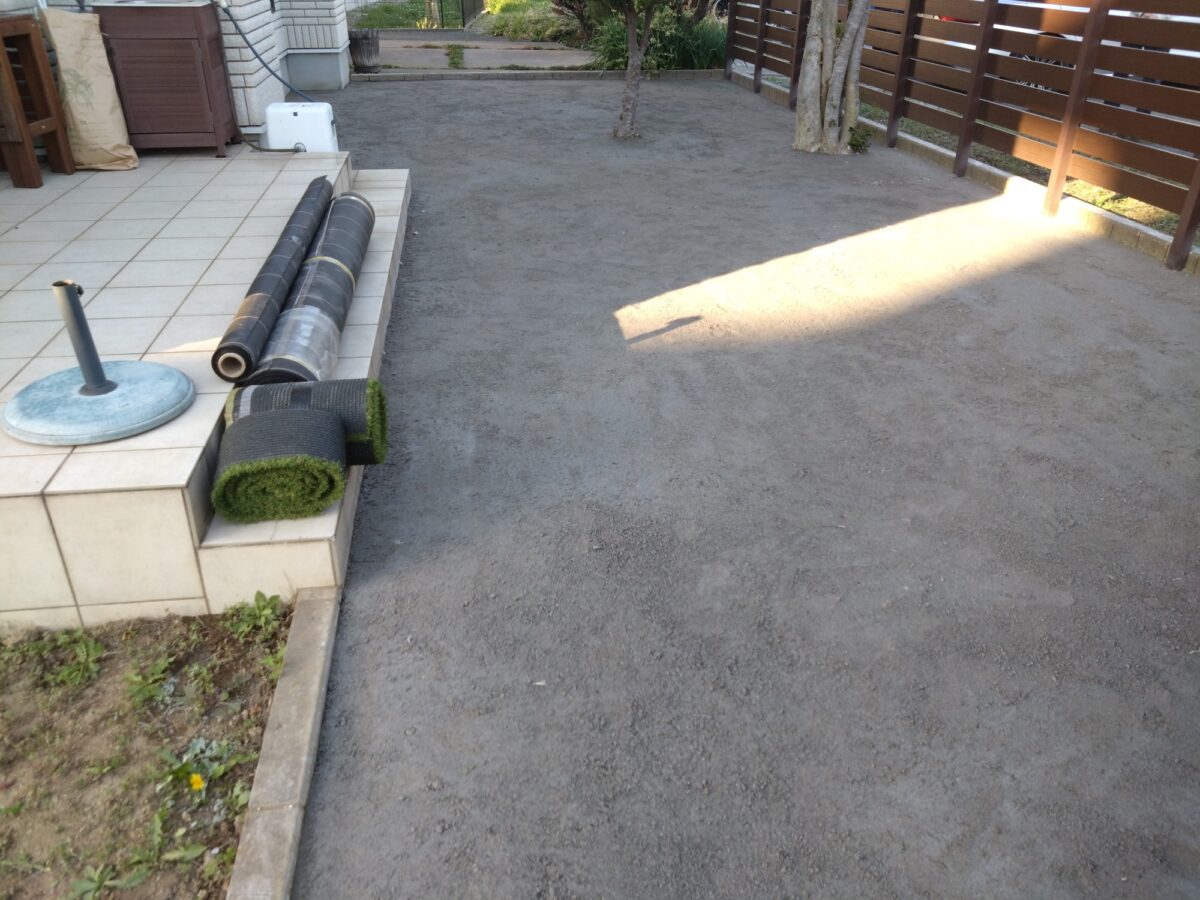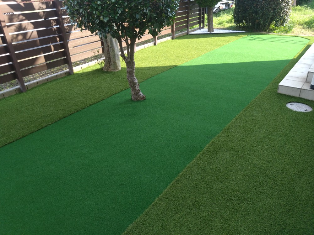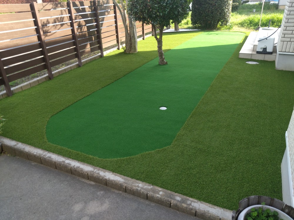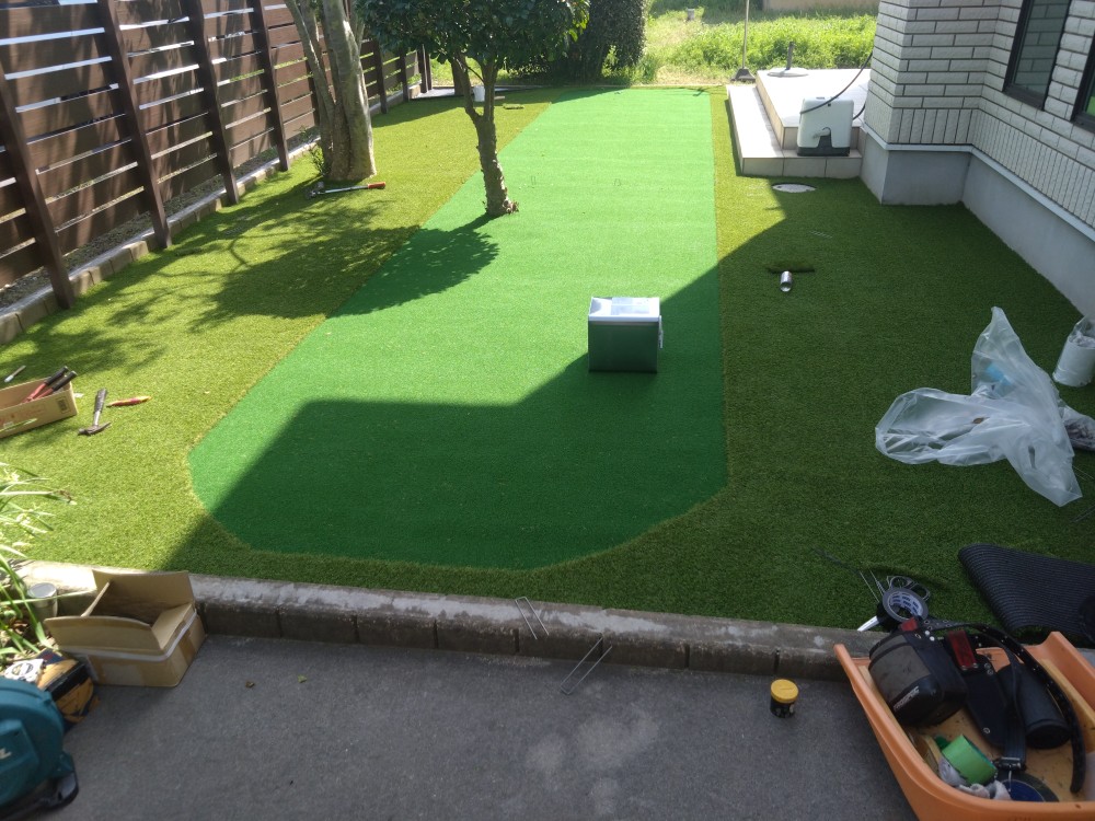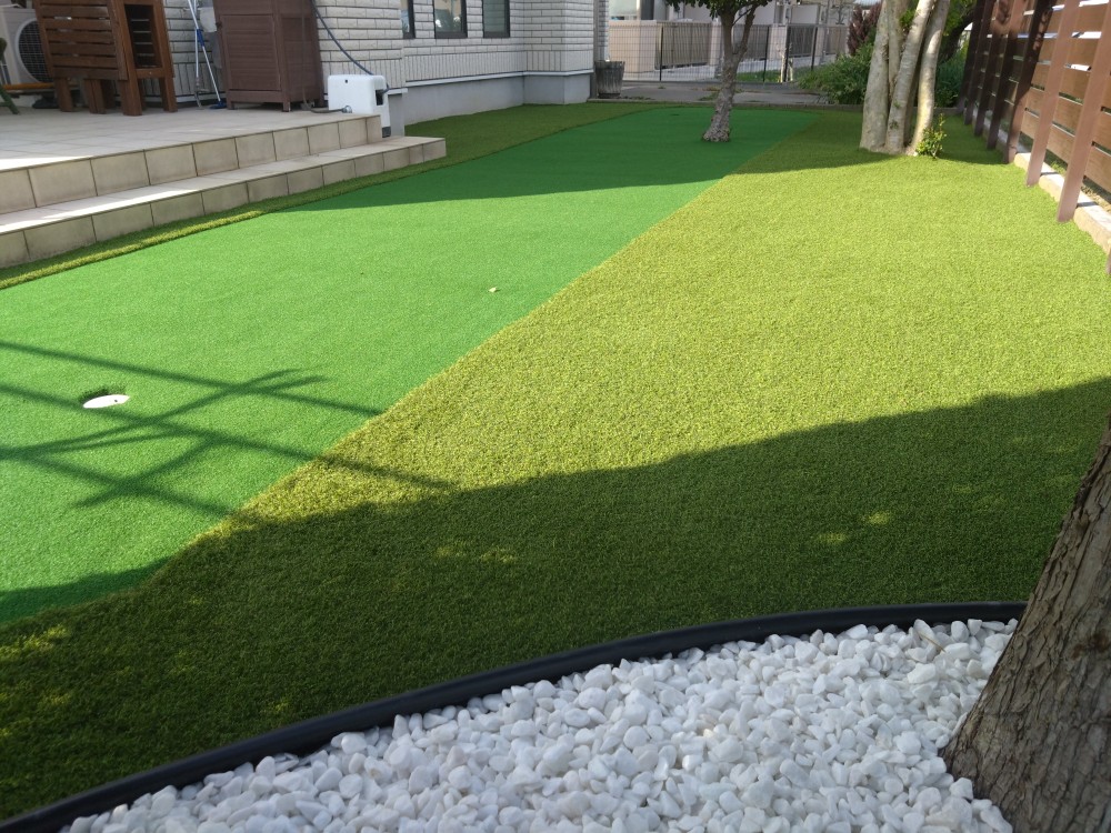 春日部市のS様邸。天然芝のお庭でしたが、日々のお庭管理も大変でもう草むしりもしたくはないし、飼われているワンちゃんも遊べてゴルフ練習もしたいとのご希望で人工芝のご依頼を頂きました。